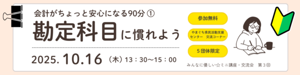 内容:会計担当になったけれど、「どうお金の記録をしたらいいか分からない…」と感じていませんか?このミニ講座では、お金の動きを整理する「勘定科目」と、記録をつける「帳簿」の基本を学びます。2回シリーズの第1回として、「会計ってこういうことか!」と少し安心できる90分です。※第2回では、仕訳から決算書までの流れを学びます。