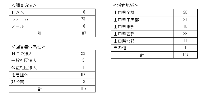 実施方法:山口県内に主たる事務所を置く非営利活動を行う法人及び任意団体のうち、情報サイト「山口県県民活動スーパーネット(以下「Sネット」)」の登録団体でメールアドレスを把握している365団体へ調査票を送付したほか、Sネット上やFacebook等で告知。