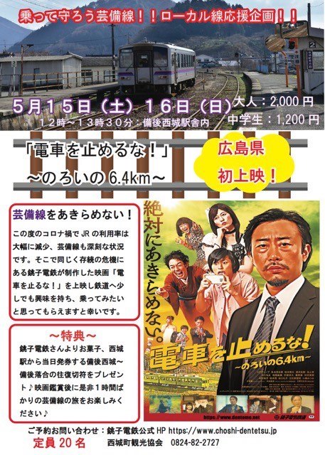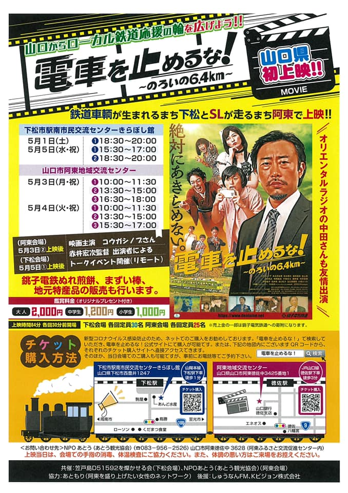 山口からローカル鉄道応援の輪を広げようを合言葉に千葉県銚子市を走る銚子電鉄が、制作した映画『電車を止めるな!のろいの6.4㎞』を山口県内2会場、SLやまぐち号の走る山口市阿東と鉄道車両が生まれる下松市で、上映しました。映画が、鉄道存続の危機にある銚子電鉄が、自社の危機を救うためにクラウドファンディングを用いて、500万円の資金を集めて自社制作した映画です。