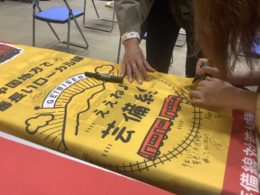 また、次に、芸備線 備後西城駅(広島県庄原市西城町)で上映される(西城観光協会主催)ことから、事前に芸備線応援ののぼり旗を、提供いただき、ここに来場された皆さんに応援メッセージを記入していただきました。備後西城駅での、上映会は延期となりましたが応援メッセージは、西城へ届けました。