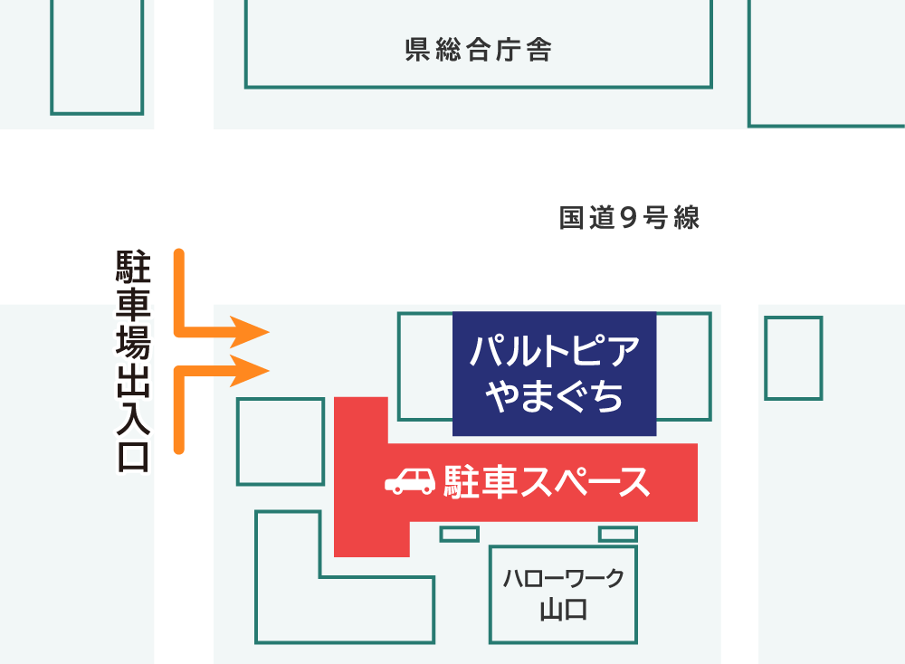 パルトピア山口(防長青年館)建物の裏側に駐車スペースがあります(50台程度)。