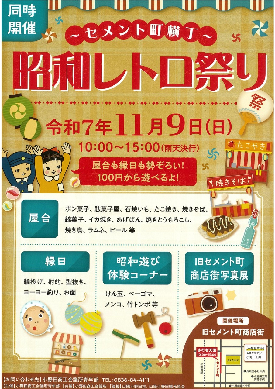 ※当日は小野田商工会議所青年部主催の「〜セメント町横丁〜昭和レトロ祭り」が、Aスクエア裏手の通りにて開催されます。詳細は下のチラシをご覧ください。